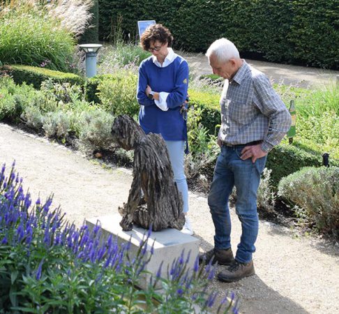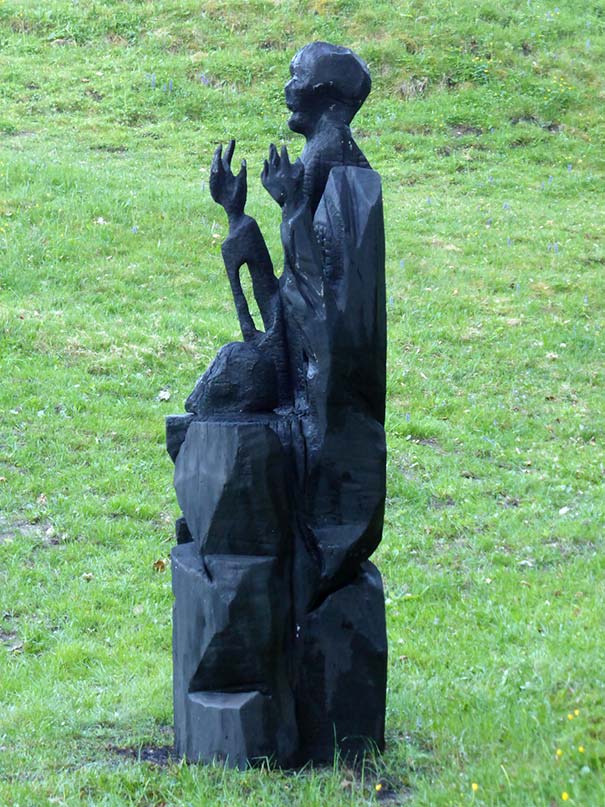 Eine weitere Skulptur Kuhnleins hat den Aufenthalt im Freien besser vertragen. Am Wasserbecken des Gartens sitzt der „Narziss“ auf einem Betonblock und schaut, getreu seinem Vorbild aus der griechischen Mythologie, selbstverliebt ins eigene Spiegelbild. Der Narziss ist in bester Verfassung – obwohl die Skulptur aus Eschenholz gefertigt ist, das nicht so witterungsbeständig wie Eiche ist. Er soll jedoch besser befestigt werden, denn er ist ein beliebtes Fotomotiv.