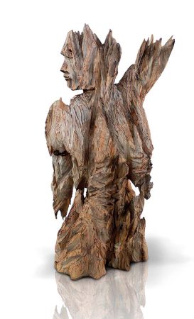 Mit der Motorsäge schneidet er tief und radikal ins Holz, reduziert seine Skulpturen aufs Wesentliche – auf ihre ausdrucksstarke Haltung. Die Köpfe und Körper sind tief eingekerbt, bei einigen Figuren reißt er ganze Fetzen heraus. „Zerklüftete“ nennt Kuhnlein diese Skulpturen, die er mit der Kettensäge aus Eichenstämmen schält – spontan, ohne Zeichnung, aber mit viel Emotion im Bauch.