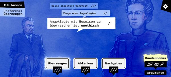 Wer sind wir, aus welcher Perspektive erzählen wir? Das haben wir uns zu Anfang gefragt. Wenn man sich die historischen Aufnahmen anschaut, sieht man nur Männer: auf der Anklagebank nur Männer, alle Richter waren Männer, die Ankläger, alle Verteidiger … aber in der zweiten Reihe waren auch Frauen an den Prozessen beteiligt. Wir haben uns eine reale Juristin im französischen Anklageteam ausgesucht: Aline Chalufour. Sie steht im Mittelpunkt des Spiels und begleitet den Prozess Somit stellen sich den Spielerinnen und Spielern implizit wichtige Fragen: Was halte ich für gerecht, was für ungerecht? Wie sollte mein Völkerstrafrecht aussehen? Sollten nur Staaten oder auch Individuen angeklagt werden. Soll über Abwesende geurteilt werden können? Wir erzählen den Hauptkriegsverbrecherprozess so, dass das Thema für die Spielerinnen und Spieler auch heute Bedeutung hat und lebendig wird: Denn Völkerstrafrecht wird immer wieder ausgehandelt.