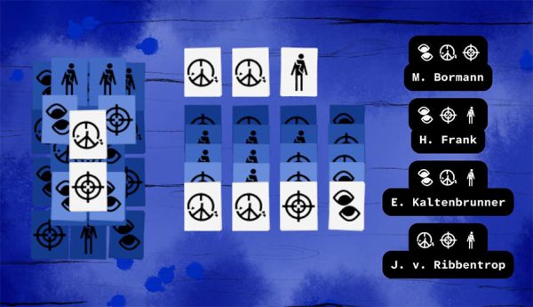 Den Plot haben wir in vier Kapitel aufgeteilt: Eröffnung des Hauptkriegsverbrecherprozesses, Beweisführung, Verteidigung, Abschlussplädoyers. Gefüllt sind sie mit schwierigeren und einfacheren Elementen, die miteinander kombiniert werden. So müssen etwa Beweisketten gebildet werden, in der Diskussionsführung werden unterschiedliche Argumente ausgetauscht und entschieden, wer überzeugender ist. Die Nürnberger Prozesse waren Dokumentenprozesse, es gab unglaublich viel Papier. Im Spiel müssen Dokumente gefunden und sortiert werden. Ich bin immer wieder überrascht und erfreut, wenn es gelingt, aus einem schwierigen, komplexen Thema ein niedrigschwelliges Spiel mit einer Spielzeit von etwa 30 Minuten zu entwickeln!
